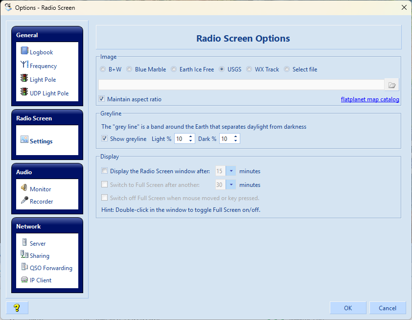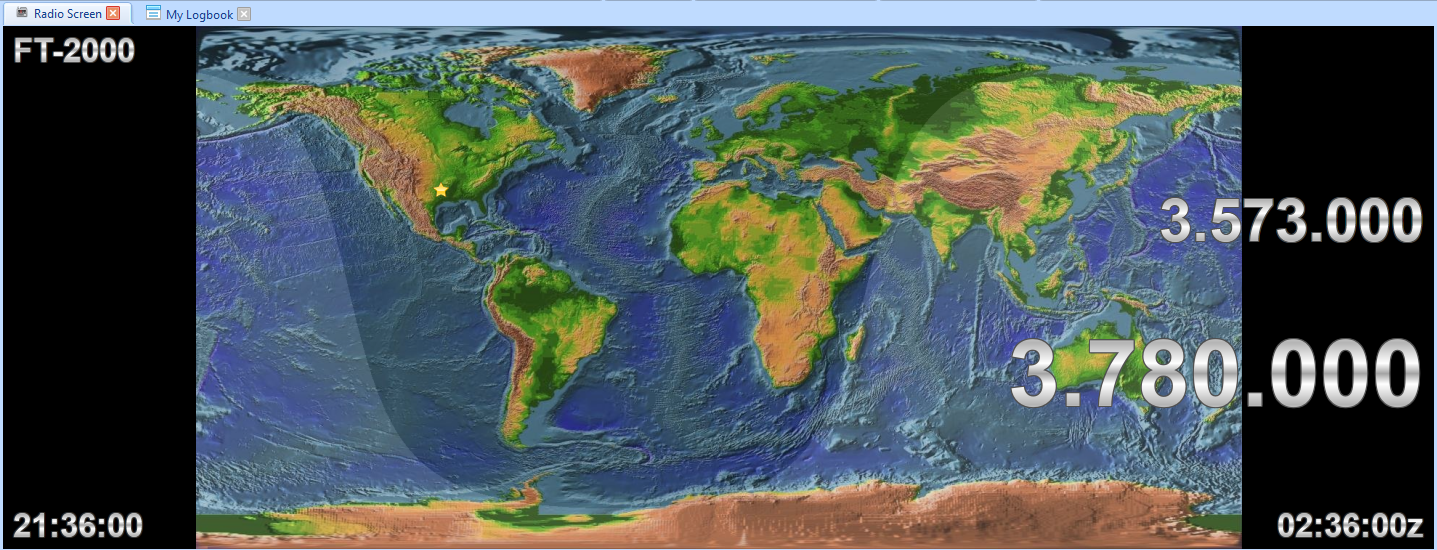 In HRD Logbook, there is a screen that shows the radio information on a screen that displays the greyline map. It looks like this: